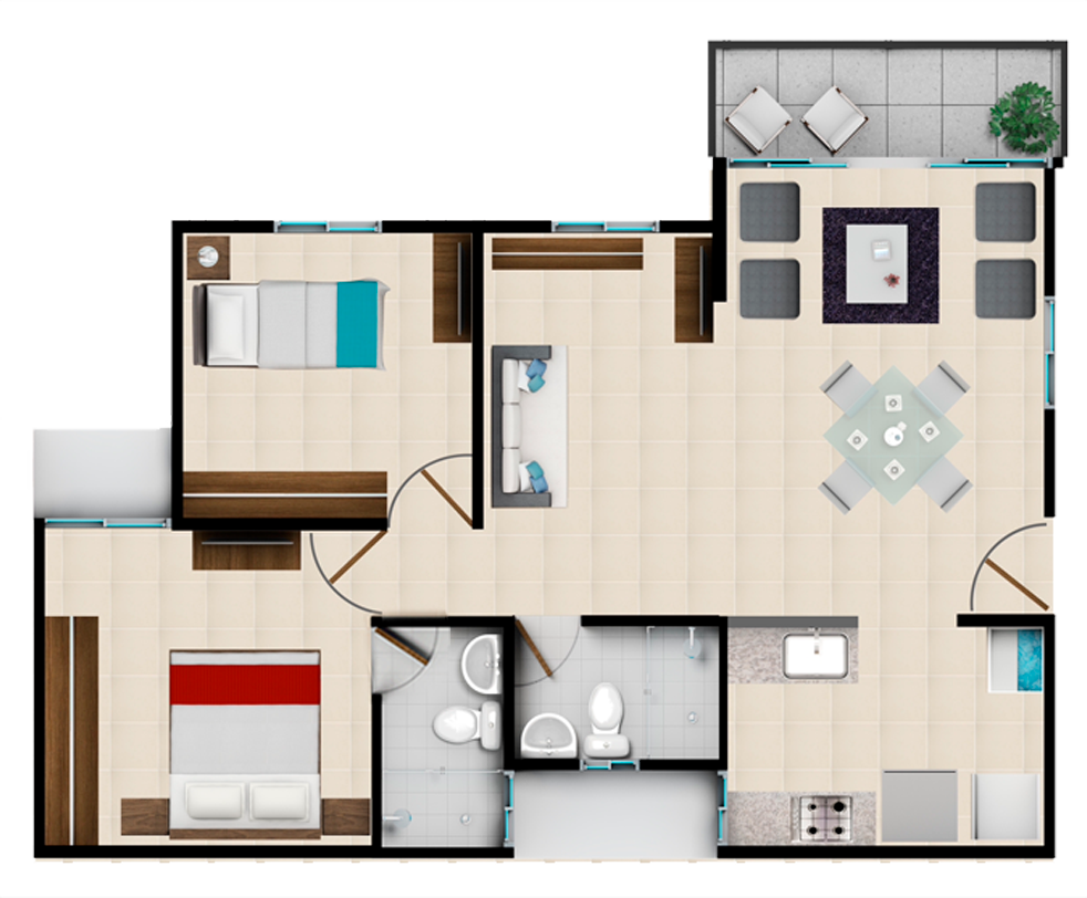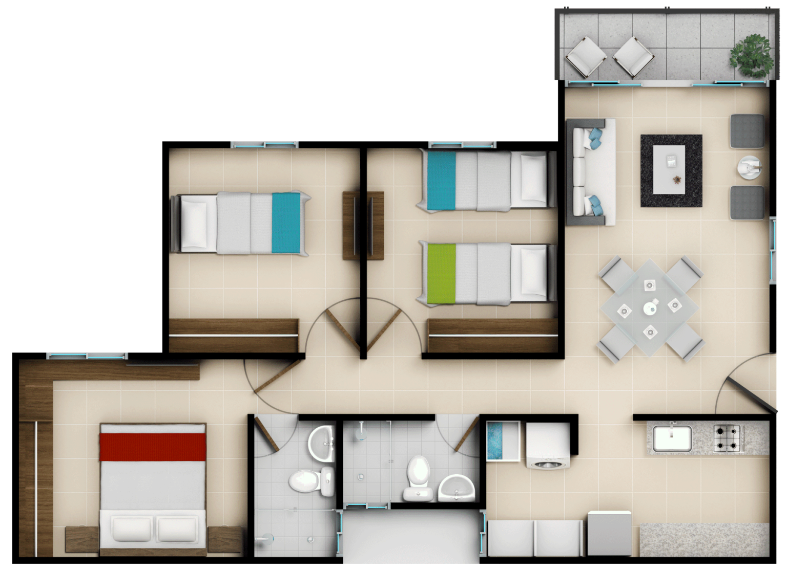 • Tipo B: 66,64 m² con 3 alcobas y 2 baños.